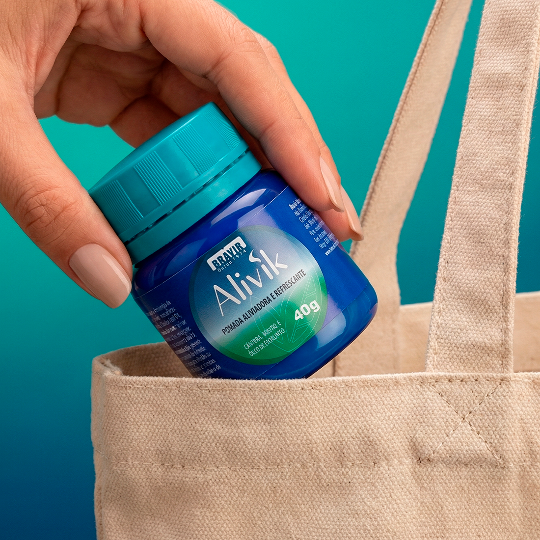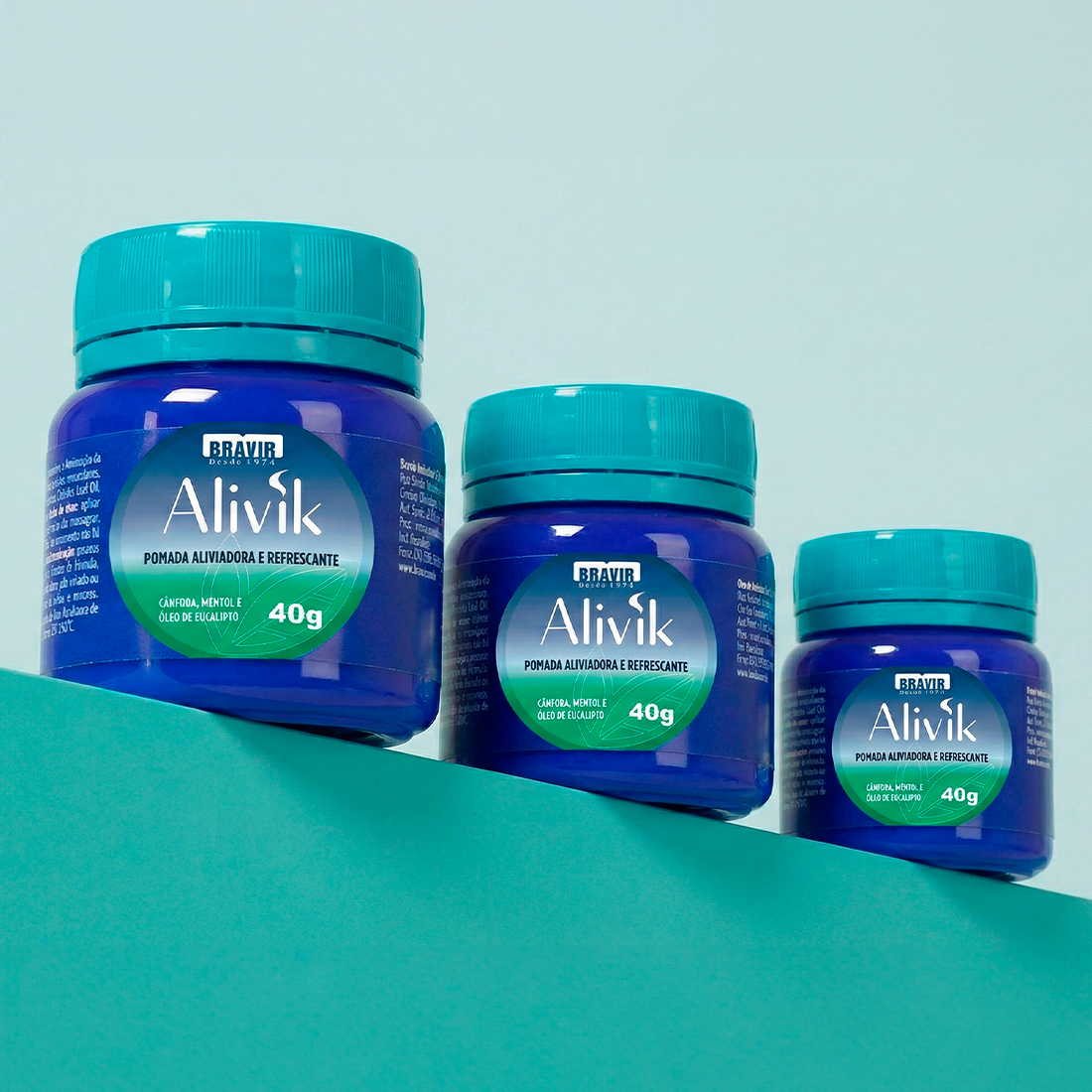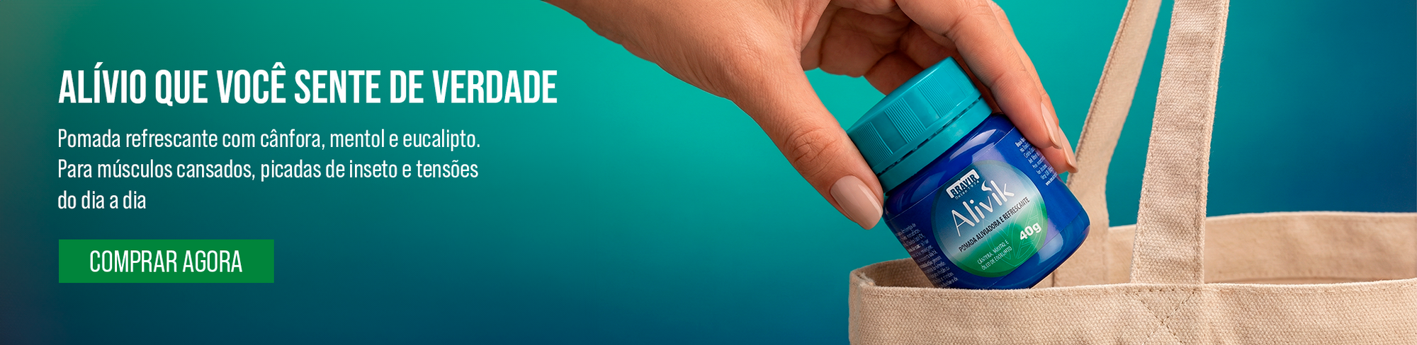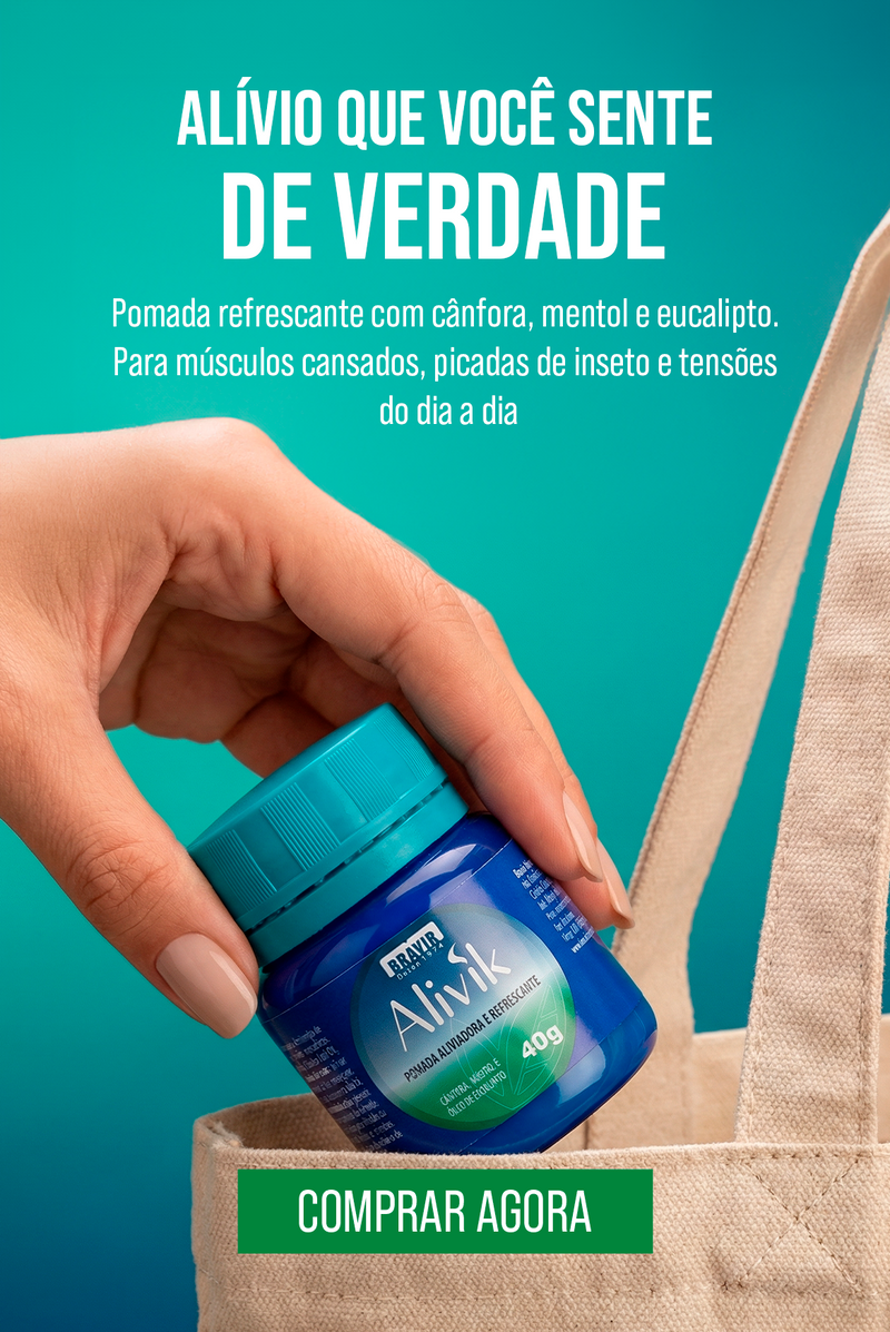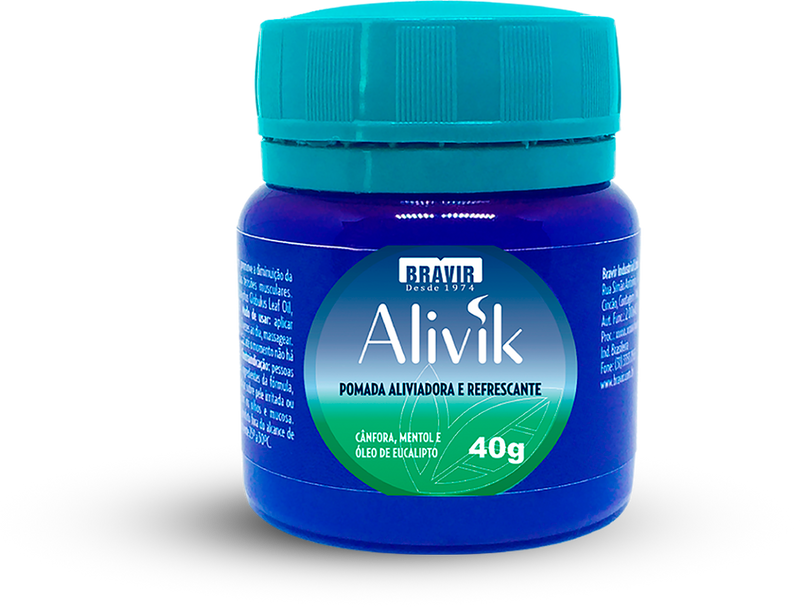 O Alivik é uma pomada de ação aliviadora e refrescante, feita para ajudar a aliviar a sensação de cansaço e as tensões do dia a dia. Com cânfora, mentol e óleo de eucalipto, ele entrega aquela sensação gostosa de cuidado, frescor e bem-estar logo após a aplicação.